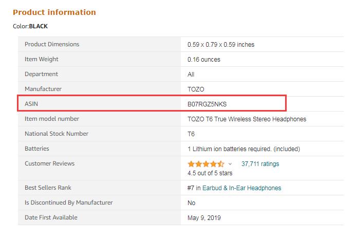 Confirming if you product is indexed or not will take just a few steps. First, you should find the ASIN of the product, for demonstration, we chose a random wireless earbuds product whose ASIN is B07RFZ5NKS.